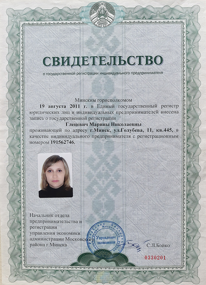 Свидетельство о регистрации №191562746 выдано 19 августа 2011г. администрацией Московского района г. Минска.